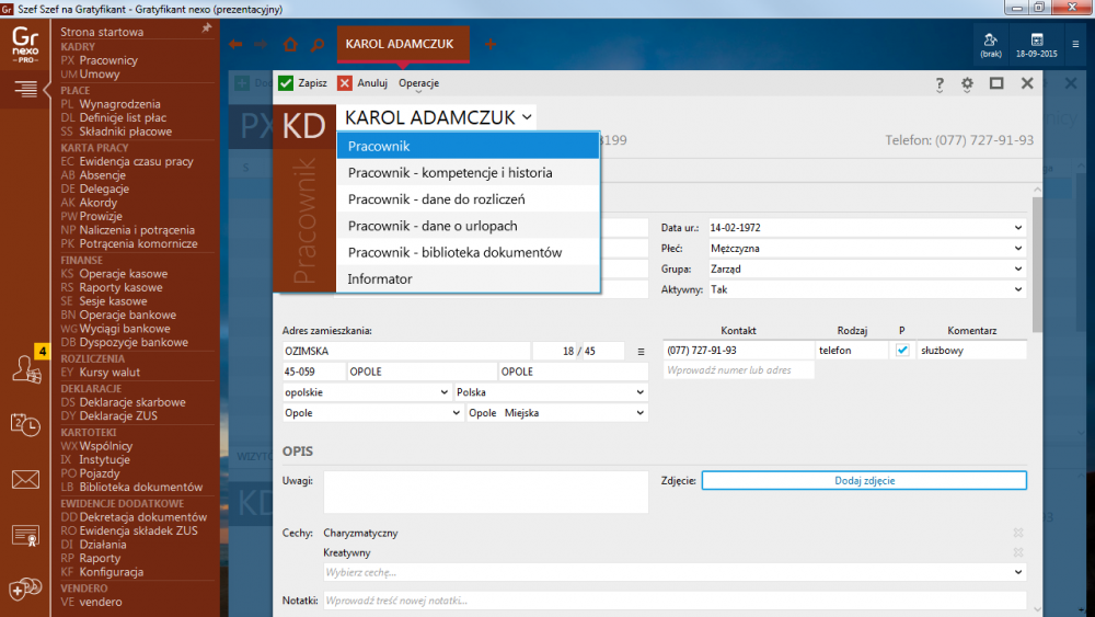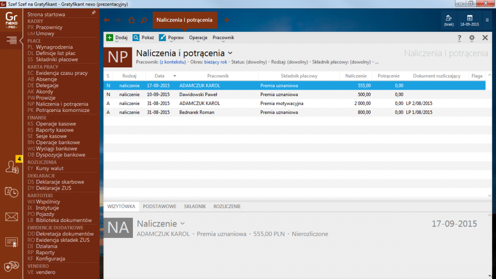 Gratyfikant nexo PRO zawiera wszystkie funkcje niezbędne w dziale kadr i płac – od prowadzenia rozbudowanej ewidencji osobowej i wystawiania umów o pracę i umów cywilnoprawnych, przez proste i zaawansowane planowanie i naliczanie wynagrodzeń, po generowanie rozliczeń z urzędem skarbowym i ZUS oraz wystawianie różnych dokumentów kadrowo-płacowych.