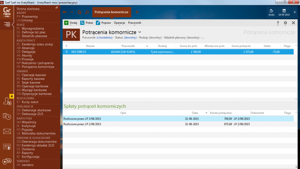 - rozliczanie ewidencji czasu pracy, akordów, prowizji, potrąceń komorniczych;