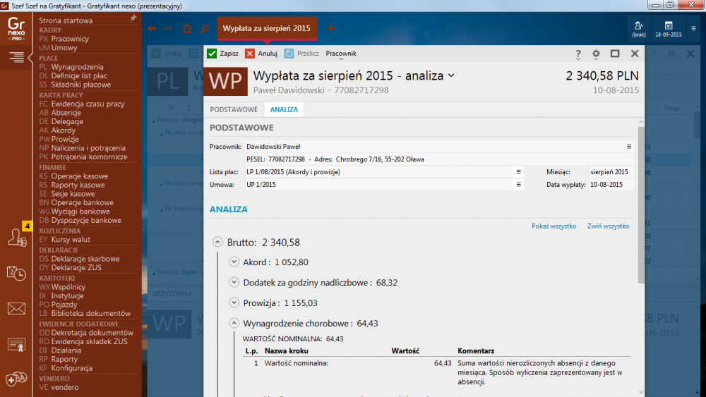 - analizator wypłaty – szczegółowy opis obliczeń poszczególnych wartości wypłaty;