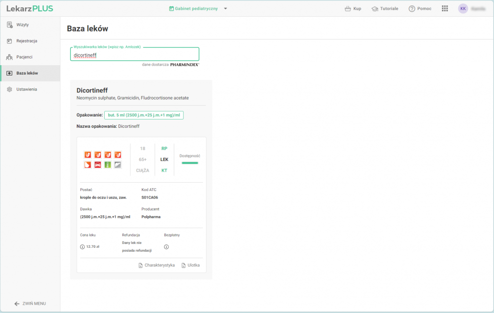 Lekarz PLUS oferuje moduł Bazy leków oparty na uznanej przez lekarzy bazie Pharmindex. Pozwala on na szybkie i intuicyjne wyszukiwanie kluczowych informacji o lekach – ich składników, dawkowania i dostępności w aptekach.