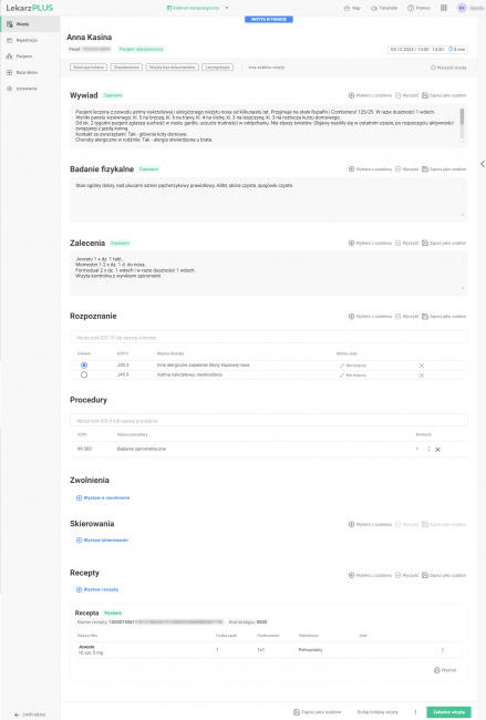 Z aplikacją Lekarz PLUS specjalista stworzy opis wizyty z uwzględnieniem wszystkich jej etapów: wywiadu, badań fizykalnych, zaleceń i rozpoznania, a także wypisze e-Recepty, e-Skierowania i e-Zwolnienia. Będzie mógł ponadto dodać własne szablony wizyt dopasowane do najczęściej przyjmowanych przypadków lub skorzystać z gotowych wzorów. Funkcjonalność ta zapewnia szybszą obsługę pacjentów, co pozwala przyjąć więcej osób w tym samym czasie. Program zapewnia również automatyczną wysyłkę raportów o zdarzeniach medycznych do systemu Ministerstwa Zdrowia P1, co jest istotne zarówno dla lekarzy, jak i dla fizjoterapeutów.