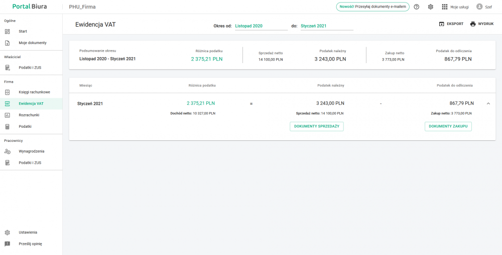 - podsumowanie ewidencji VAT oraz zapisów szczegółowych sprzedaży i zakupu,