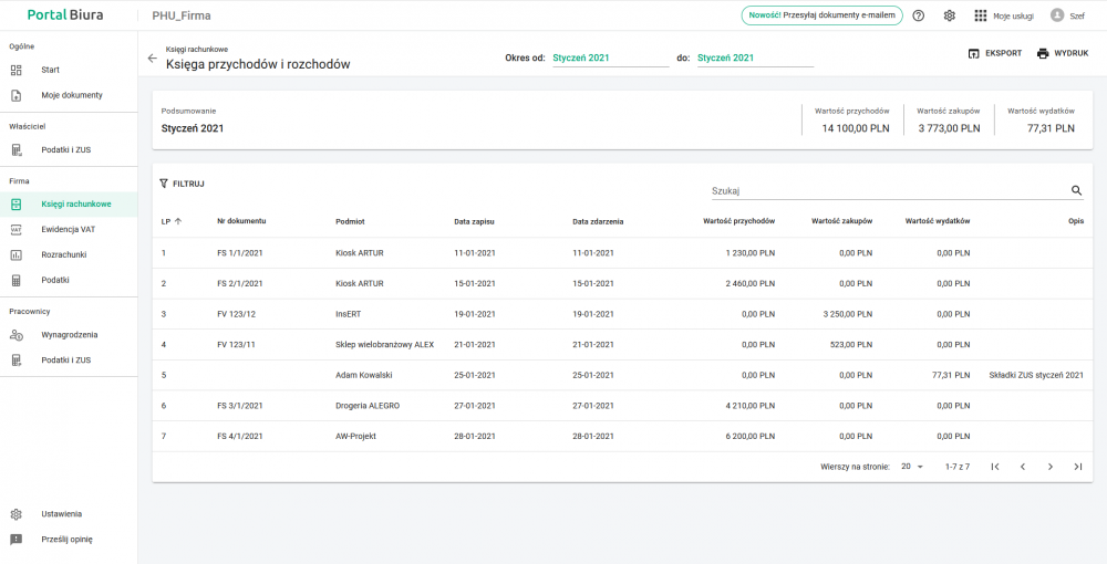 - podsumowanie ksiąg rachunkowych, w tym również ich poszczególne zapisy (dla księgowości uproszonej),