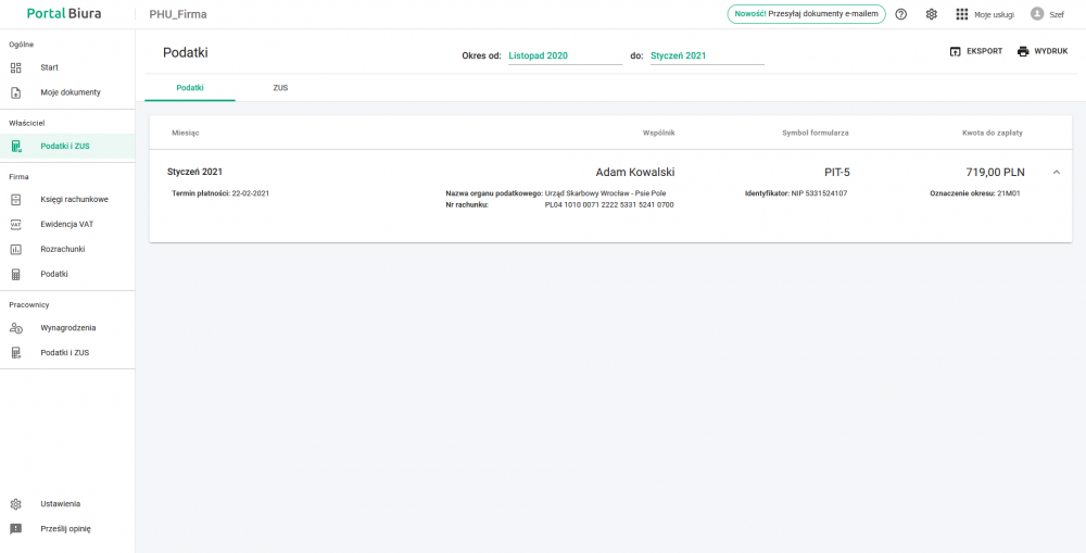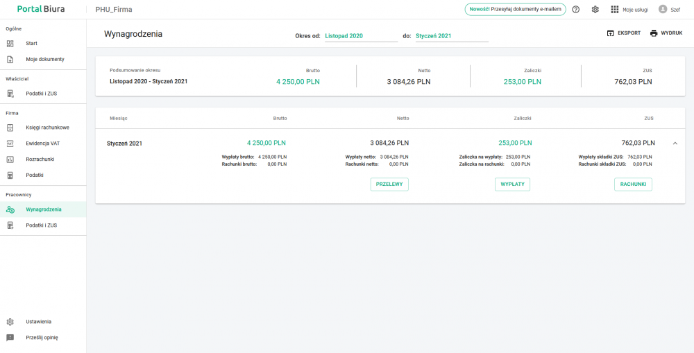 - podsumowanie zobowiązań wobec instytucji prawnych oraz pracowników, wraz z danymi niezbędnymi do wykonania przelewów;