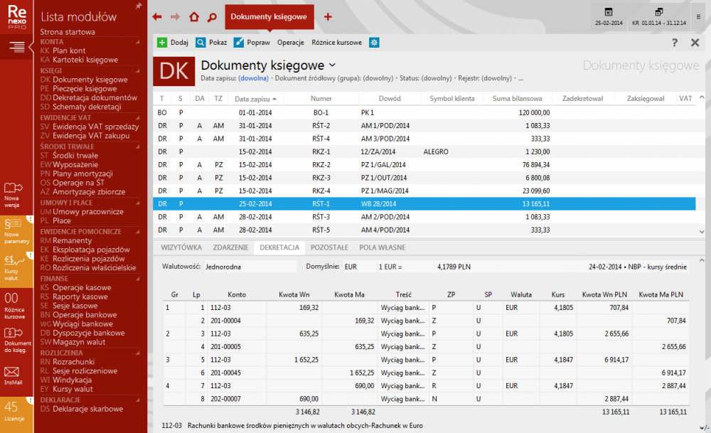 - ewidencja i rozliczanie rozrachunków, naliczanie różnic kursowych, integracja z zapisami księgowymi KPiR bądź EP oraz z zapisami VAT;
