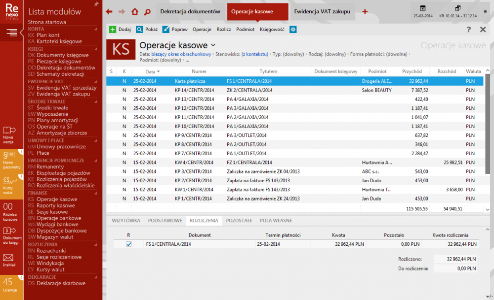 - ewidencja i rozliczanie rozrachunków, integracja z zapisami na konta oraz z zapisami VAT;