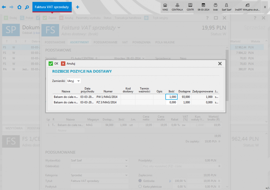 - obsługa zamienników – prostych zbiorów towarów bądź usług, które na dokumentach można wymienić za pomocą specjalnej funkcji pomiędzy elementami z tego samego zbioru;
