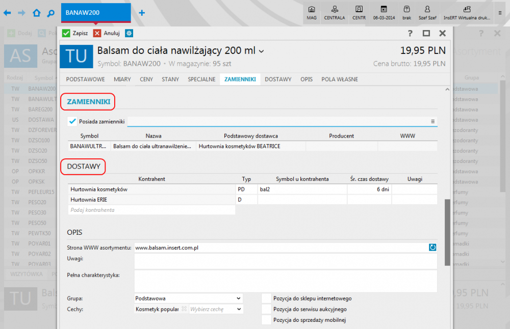 - możliwość zdefiniowania wielu dostawców asortymentu z wyróżnionym jednym głównym dostawcą i producentem (każdemu dostawcy można przypisać dla danego asortymentu zarówno zestaw jego indywidualnych symboli, jak i terminy dostawy);