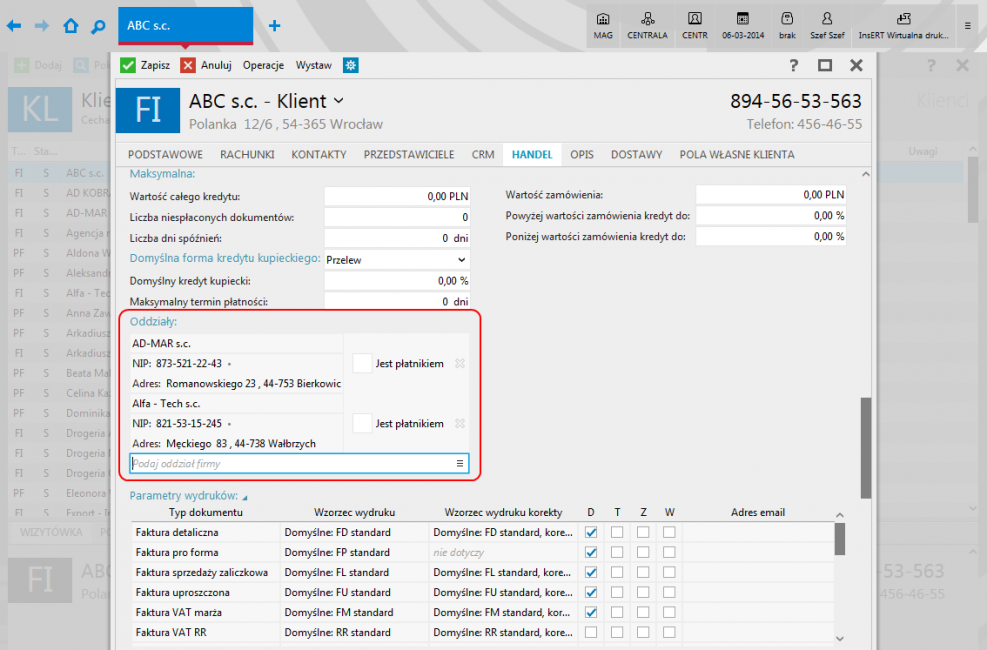 - obsługa oddziałów firmy (z każdym oddziałem jest związany cennik główny, który jest domyślny dla każdego wystawianego do niego dokumentu handlowego);