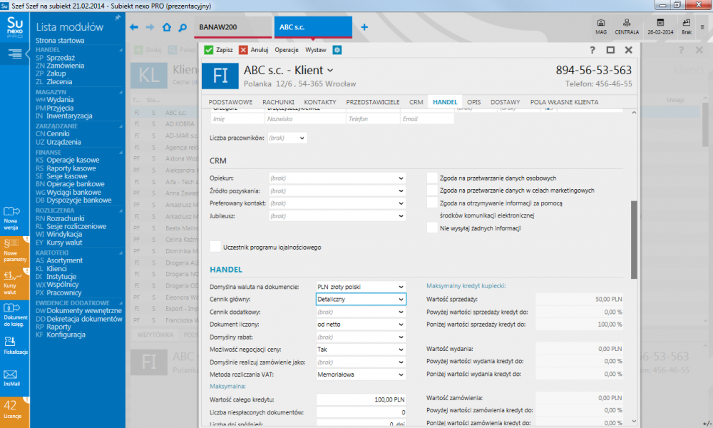 - kartoteka klientów obejmująca również informacje typu CRM;