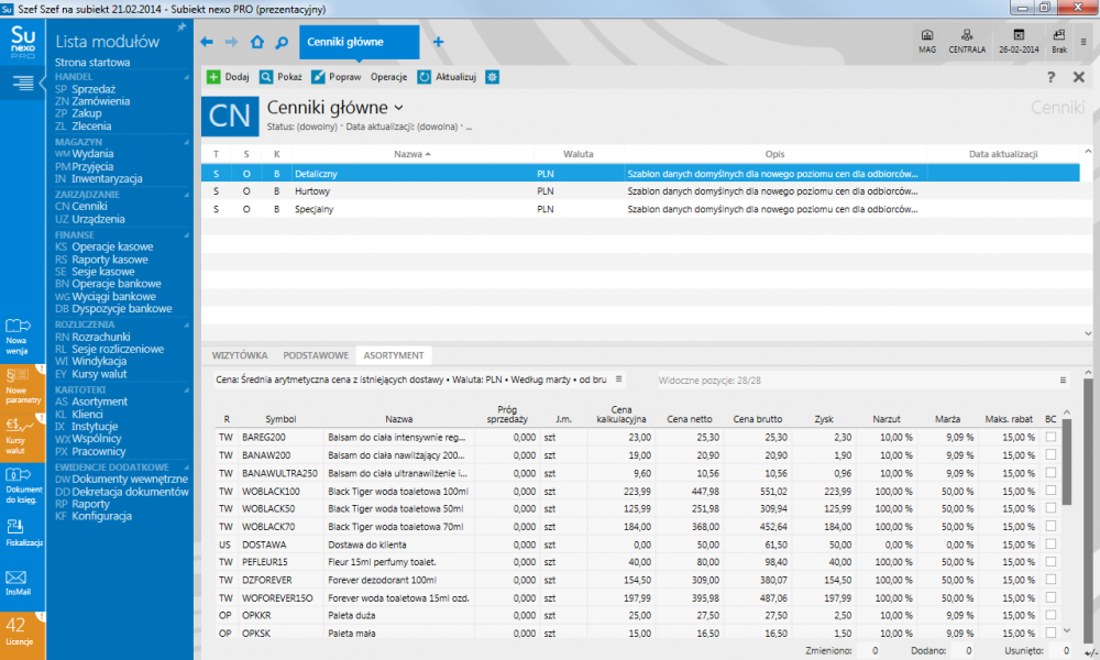 - prowadzenie elastycznej polityki cenowej – możliwość przypisywania zdefiniowanych cenników do poszczególnych klientów; cena, domyślny i maksymalny rabat pozycji cennika mogą być określane w zależności od jednostki miary i wysokości progu sprzedaży;