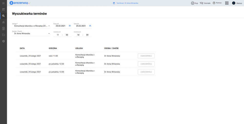 - wyszukiwarka terminów – szybkie wyszukiwanie terminów oraz filtrowanie wybranych rezerwacji według różnorodnych parametrów;