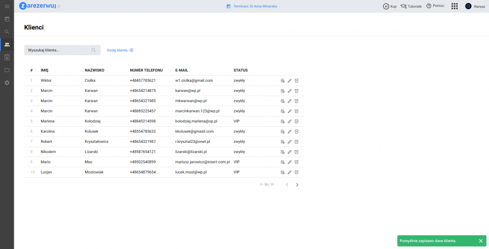 - klienci – lista klientów wraz historią rezerwacji, danymi kontaktowymi i notatkami oraz ich statusy (zwykły, VIP);