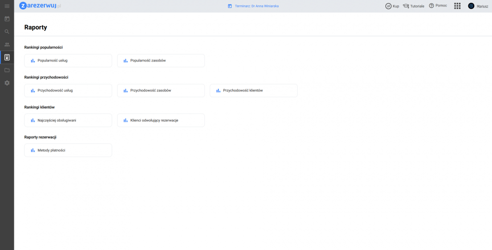 - raporty – rankingi popularności usług, zasobów, klientów i metod płatności oraz przychodów z rezerwacji konkretnych usług;