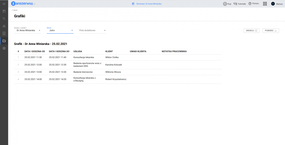 - dokumenty – cennik rezerwacji, grafiki pracowników i zasobów, możliwość ich pobierania i drukowania;